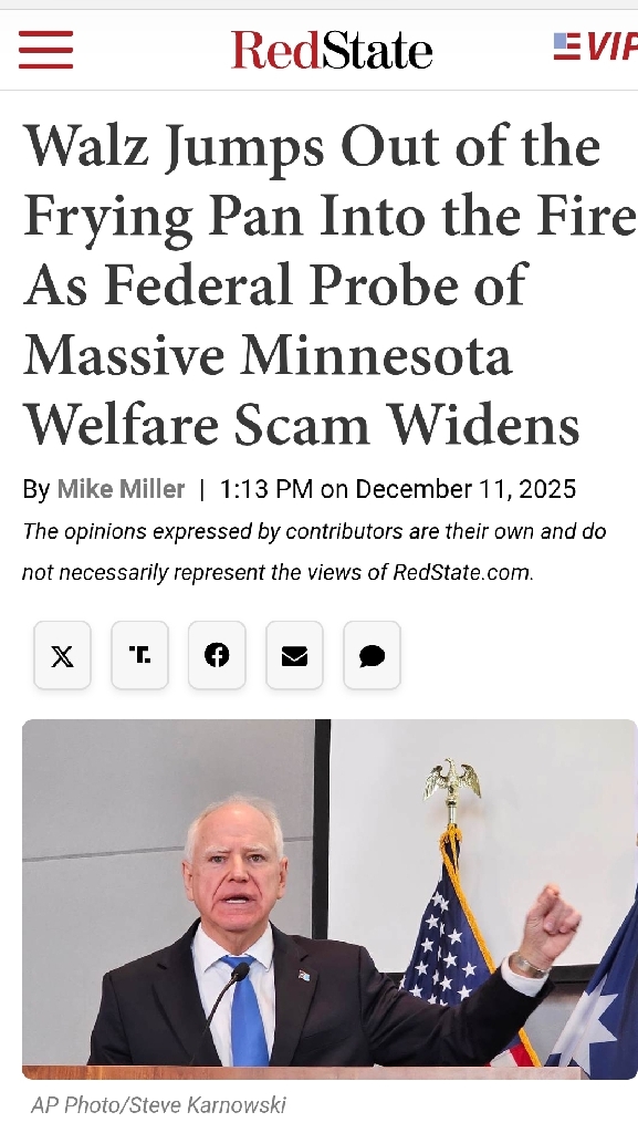 What's News? Democrat Tampon-Tim Is In Some Really Deep Do-Do... https://redstate.com/mike_miller/2025/12/11/walz-defiantly-jumps-out-of-the-frying-pan-as-federal-probe-of-massive-minnesota-welfare-scam-widens-n2197027