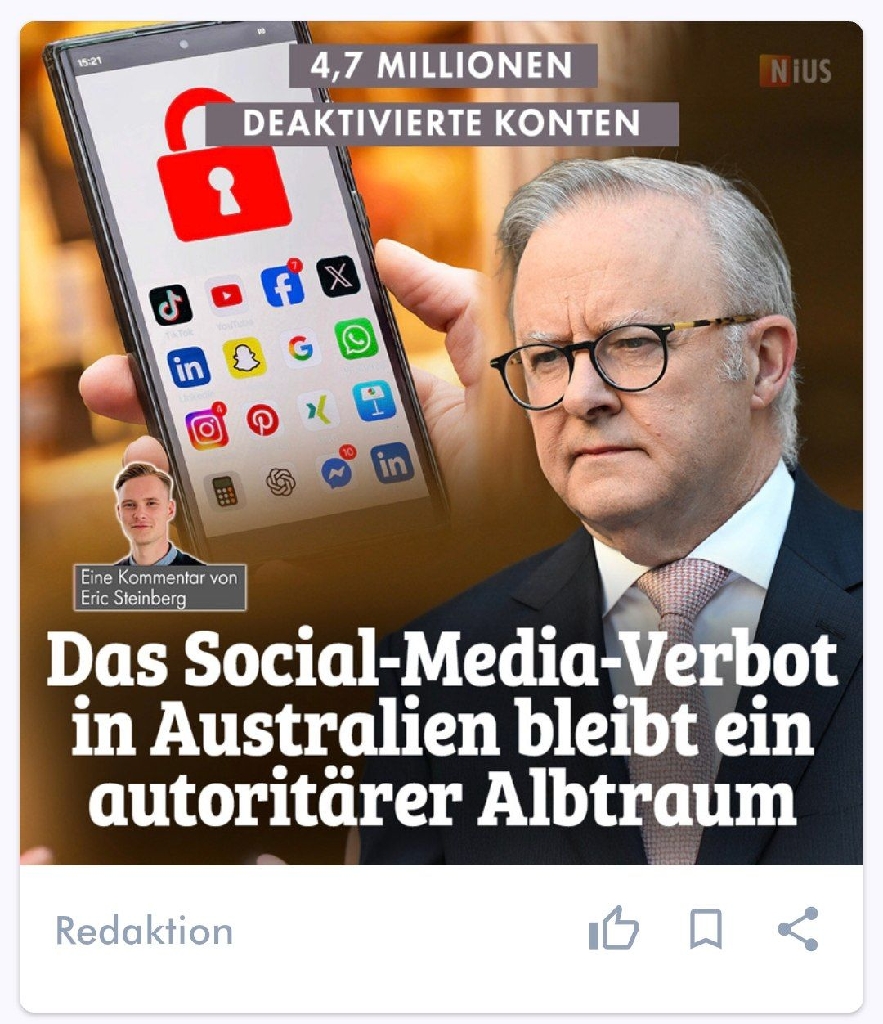 4,7 Millionen deaktivierte Konten: Das Social-Media-Verbot in Australien bleibt ein autoritärer Albtraum https://nius.de/articles/millionen-deaktivierte-konten-autoritaeres-social-media-verbot-australien/1a50d506-7d67-464d-82f8-3a5e85092f9a