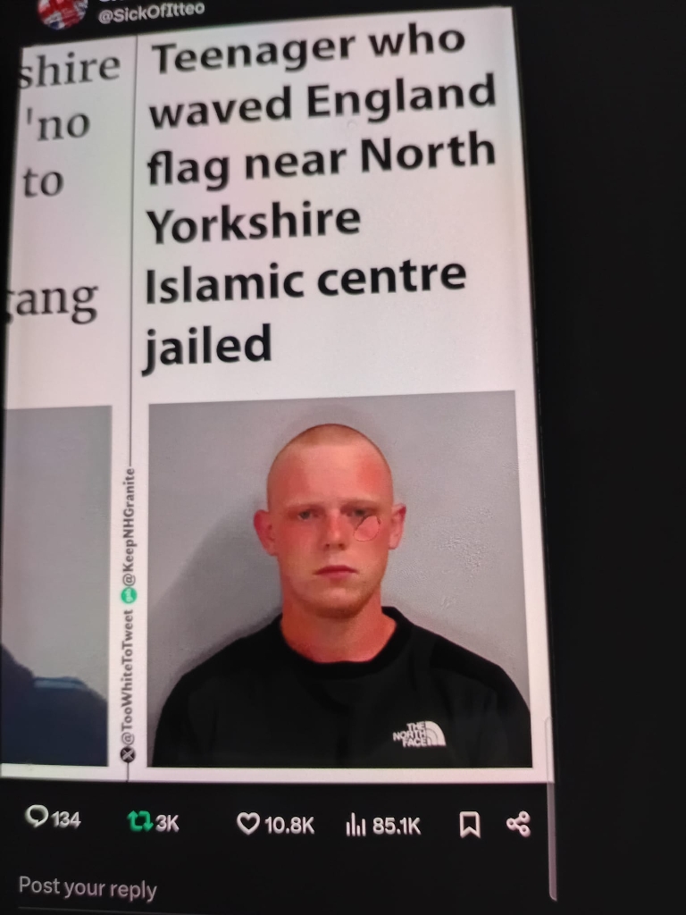 This kid sent to prison for waving the British flag, his flag outside an illegal immigrants centre.