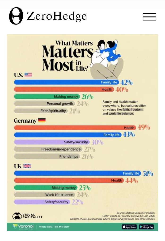 What's News? What Is Most Important?... In The USA, UK and Germany... https://www.zerohedge.com/personal-finance/heres-what-people-value-most-us-uk-germany