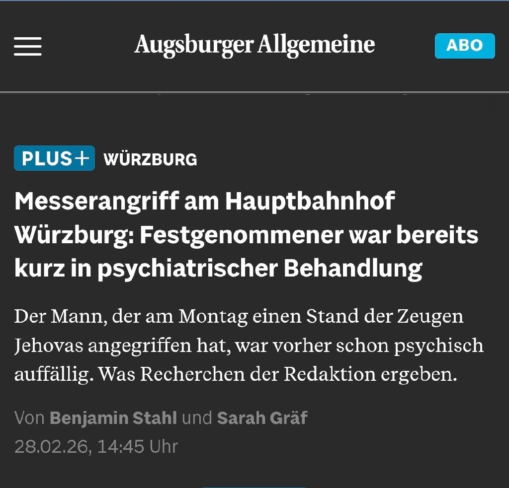Der Mann, der am Montag einen Stand der Zeugen Jehovas angegriffen hat, war vorher schon psychisch auffällig. Was Recherchen der Redaktion ergeben. Mehr unter: https://www.augsburger-allgemeine.de/113611846