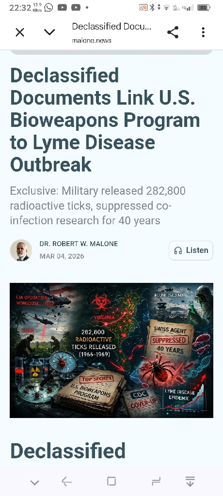 ? Dr Robert Malone : des documents déclassifiés révèlent que l'armée américaine a libéré 282 800 tiques radioactives, provoquant une épidémie de maladie de Lyme et 40 ans de dissimSee more...