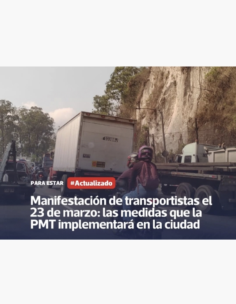 Para estar #Actualizado 🚛 Manifestación de transportistas el 23 de marzo en la Ciudad de Guatemala. La PMT anuncia medidas de tránsito ante las movilizaciones. ¿Cómo afectará la circulación en la capital?