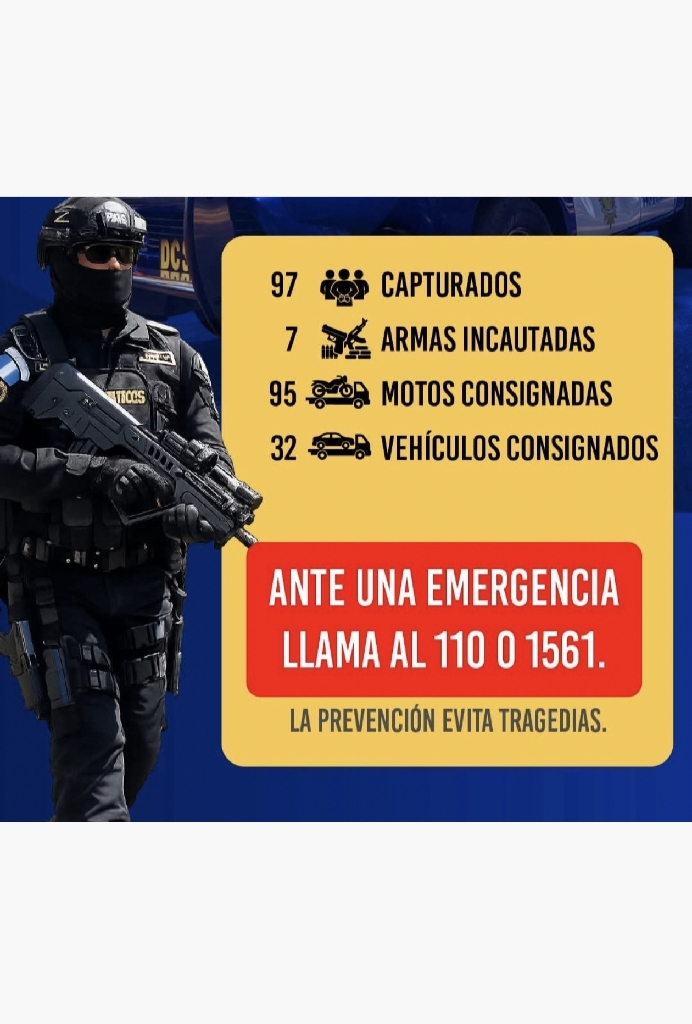 𝐑𝐄𝐒𝐔𝐌𝐄𝐍 𝐃𝐄 𝟐𝟒 𝐇𝐎𝐑𝐀𝐒 97 capturados y 95 motos consignadas en 24 horas. Resultados reales en la lucha contra el delito. Ante cualquier emergencia, llama al 110 o 1561. La prevención empieza con una llamada.