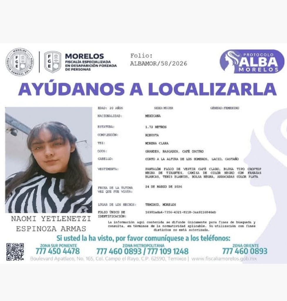 AYÚDANOS A ENCONTRAR A NAOMI YETLENETZI Solicitamos de tu colaboración para encontrar a Naomi Yetlenetzi Espinoza Armas de 20 años de edad, vista por última vez el 24 de marzo en Temixco, Morelos.