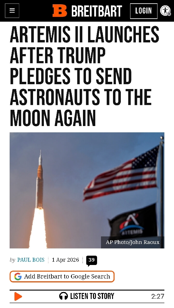 What's News? Trump Re-Invigorates NASA... To The Moon... https://www.breitbart.com/politics/2026/04/01/artemis-ii-launches-after-trump-pledges-to-send-astronauts-to-the-moon-again/